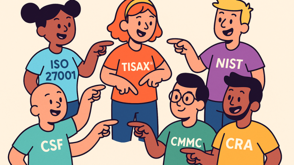 Treat ISO 27001, CSF – or TISAX® if you’re in the automotive sphere – as your management backbone. Use NIST 800-53 or CIS Controls to define your control set. Secure your production environment with IEC 62443 and NIST 800-82. Then add the sector and regional layers your markets demand – CMMC for U.S. defense, TISAX® again for automotive suppliers and service providers. Then roll out product specific requirements like UNECE R155 / ISO 21434 for automotive vehicles, and CRA / NIS2 for the EU’s digital and operational products.